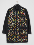 Pinback buttons; celluoid, enamel, steel, aluminum and copper on black denim overshirt with embroidered necklabel. Painted hanger in wood and steel.